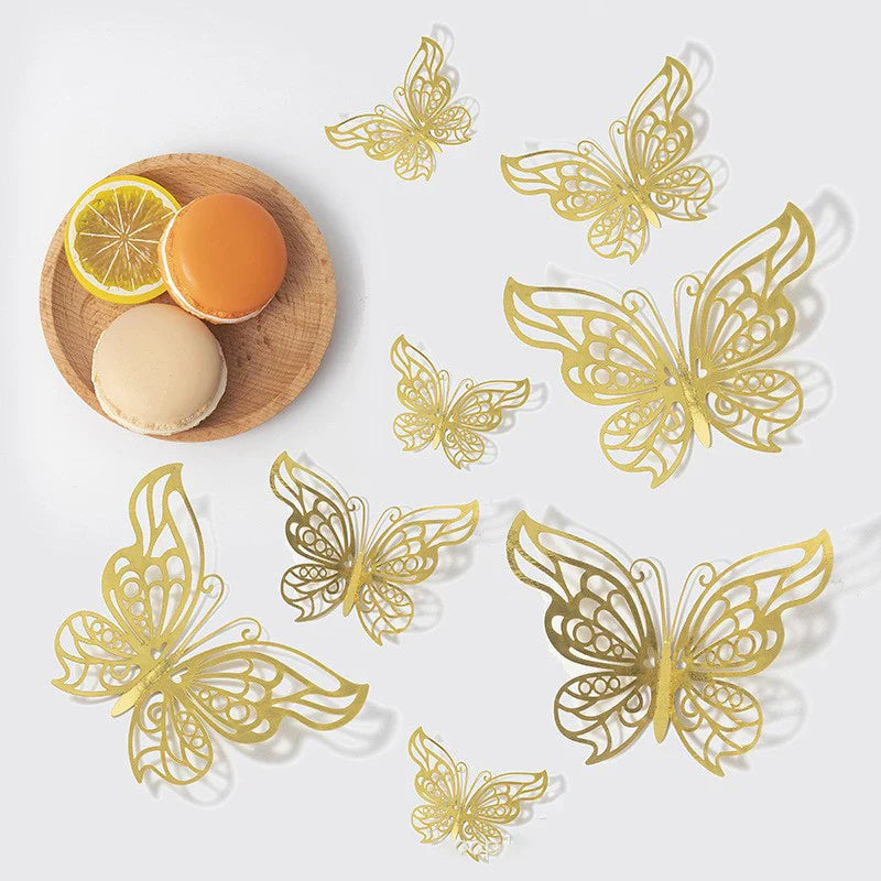 Includes 48 gold butterflies in 4 distinct styles and 3 sizes for versatile decorationEasy to apply and remove, with adhesive dots included for hassle-free setupPerfect for butterfly-themed birthday parties, cake decorations, and room enhancementsAdds a whimsical and elegant touch to walls, ceilings, and party backdropsReusable design allows for creative arrangements and repeated useGreat for decorating living rooms, bedrooms, nurseries, or event venues