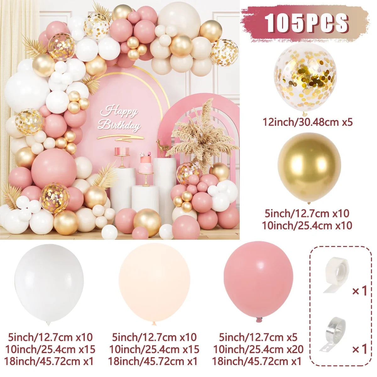 🎈 Includes a mix of pink, white, and metallic gold balloons in various sizes for a stylish layered look