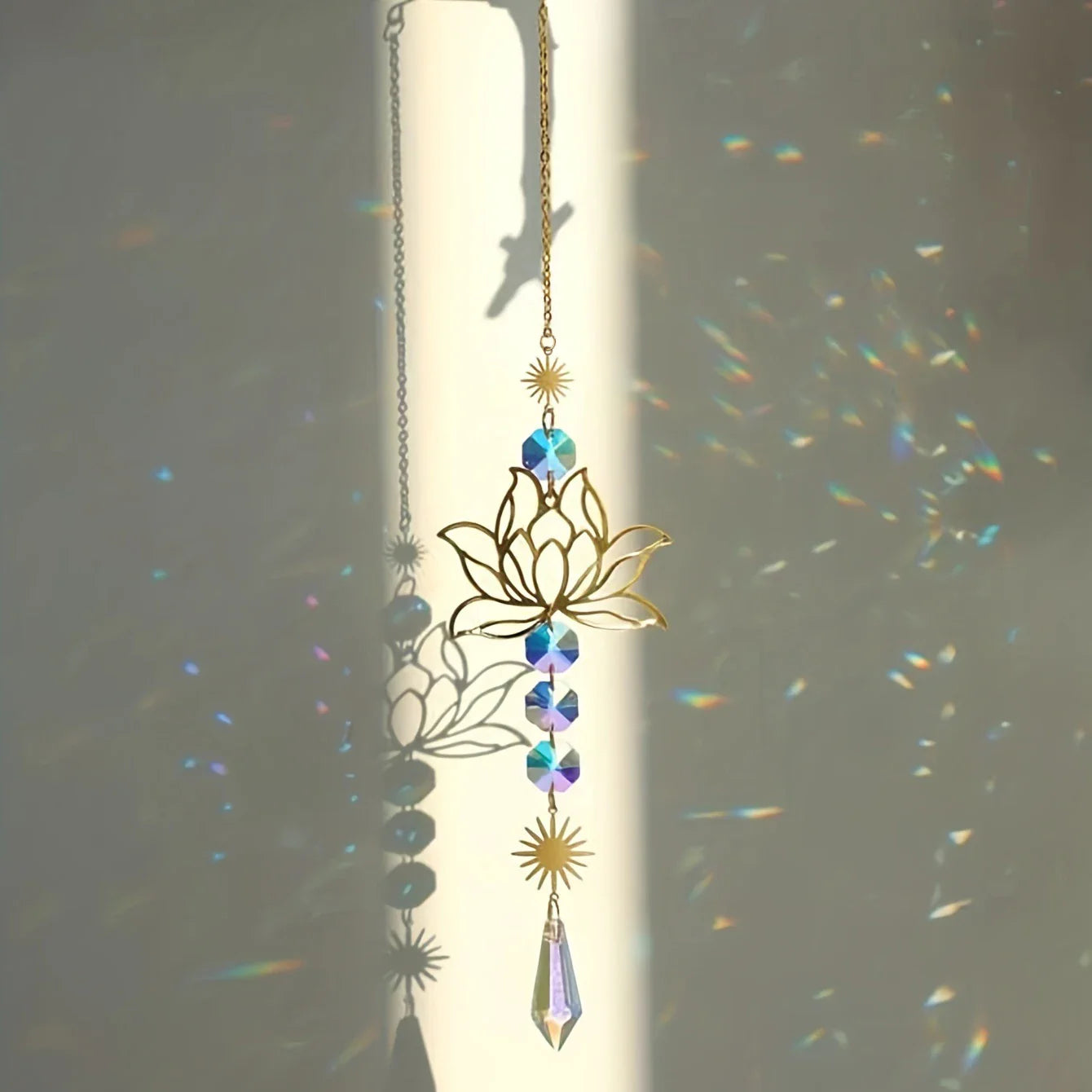 Enhance your living space with this exquisite Metal Lotus and Artificial Crystal Suncatcher Charm — a perfect blend of elegance and tranquility for any home or garden setting.
