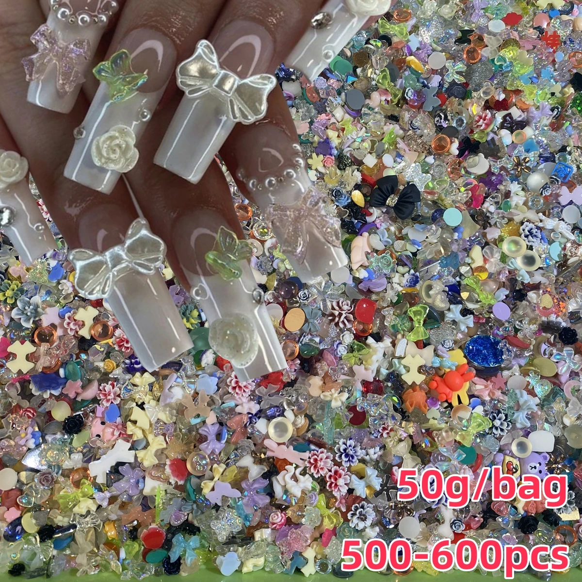 Transform your manicure into a work of art with these 500-600pcs mixed bowknot, heart, and flower nail charms. Perfect for anyone who loves Korean nail art and kawaii aesthetics!
